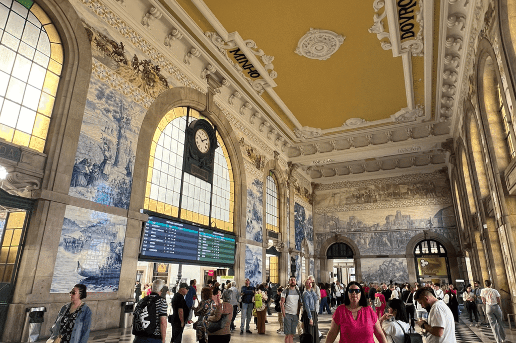 As you step into the São Bento Railway Station you’re greeted by the grandeur of over 20,000 azulejo tiles, which cover the walls in intricate blue-and-white designs. These hand-painted tiles, created by artist Jorge Colaço in the early 20th century, tell the story of Portugal’s rich history.